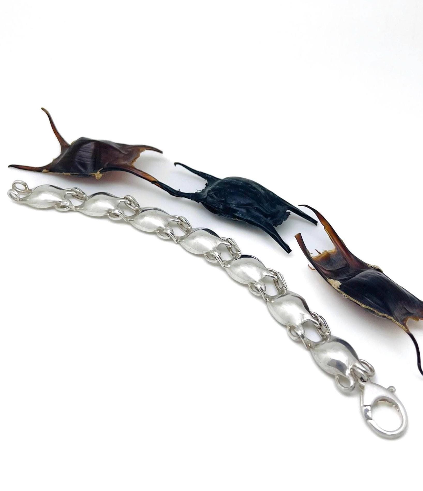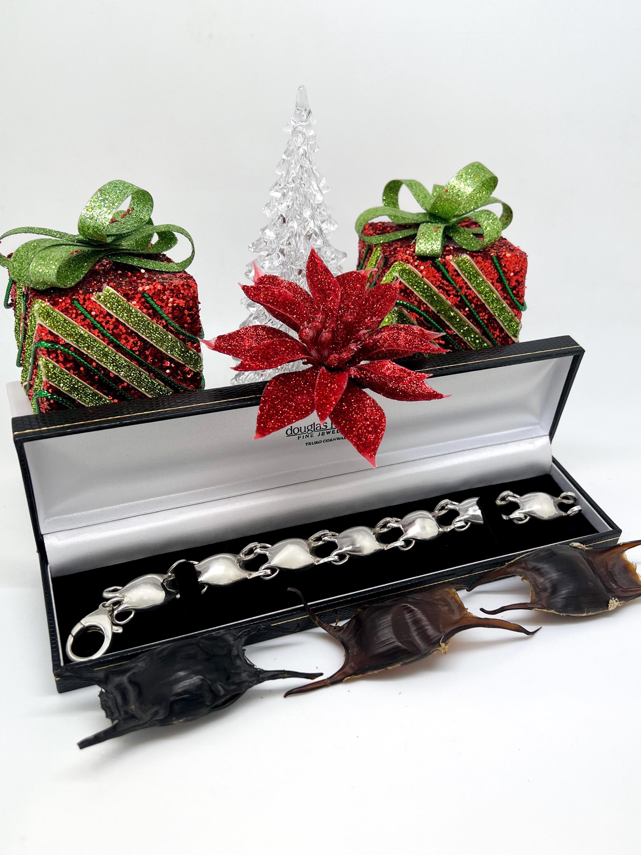 After combing Mawgan Porth beach for hidden treasures, Doug and Linda Hughes found a collection of beautiful mermaid’s purses. Inspired by these gorgeous gifts from the ocean, Doug has added another special piece to our Seaside collection with this expertly handmade bracelet comprising a string of solid silver mermaid’s purses.