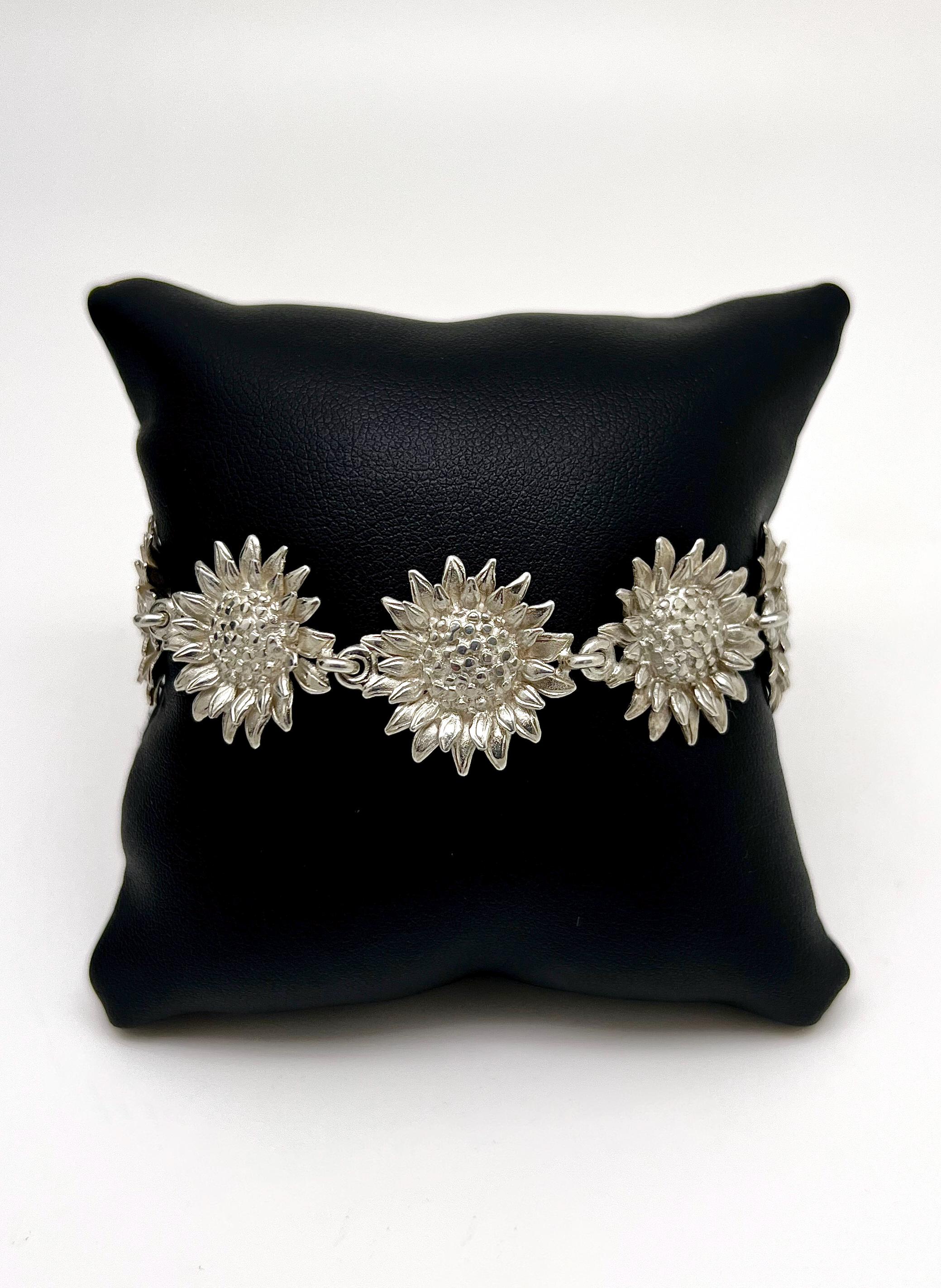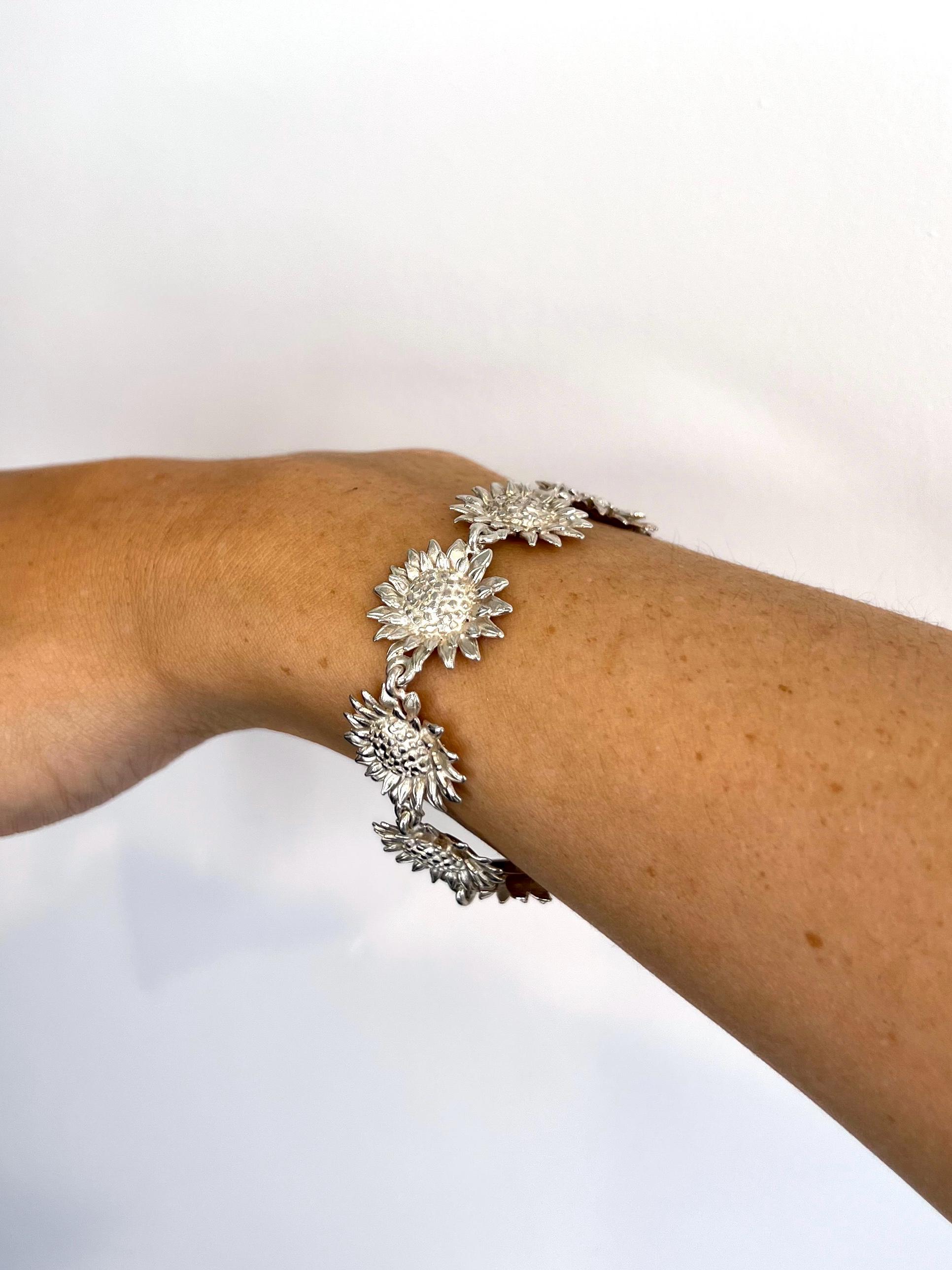 This unique sunflower bracelet features 8 intricately detailed silver sunflowers that gracefully wrap around your wrist, adding a soft, floral elegance to any outfit, perfect for everyday wear or special occasions.