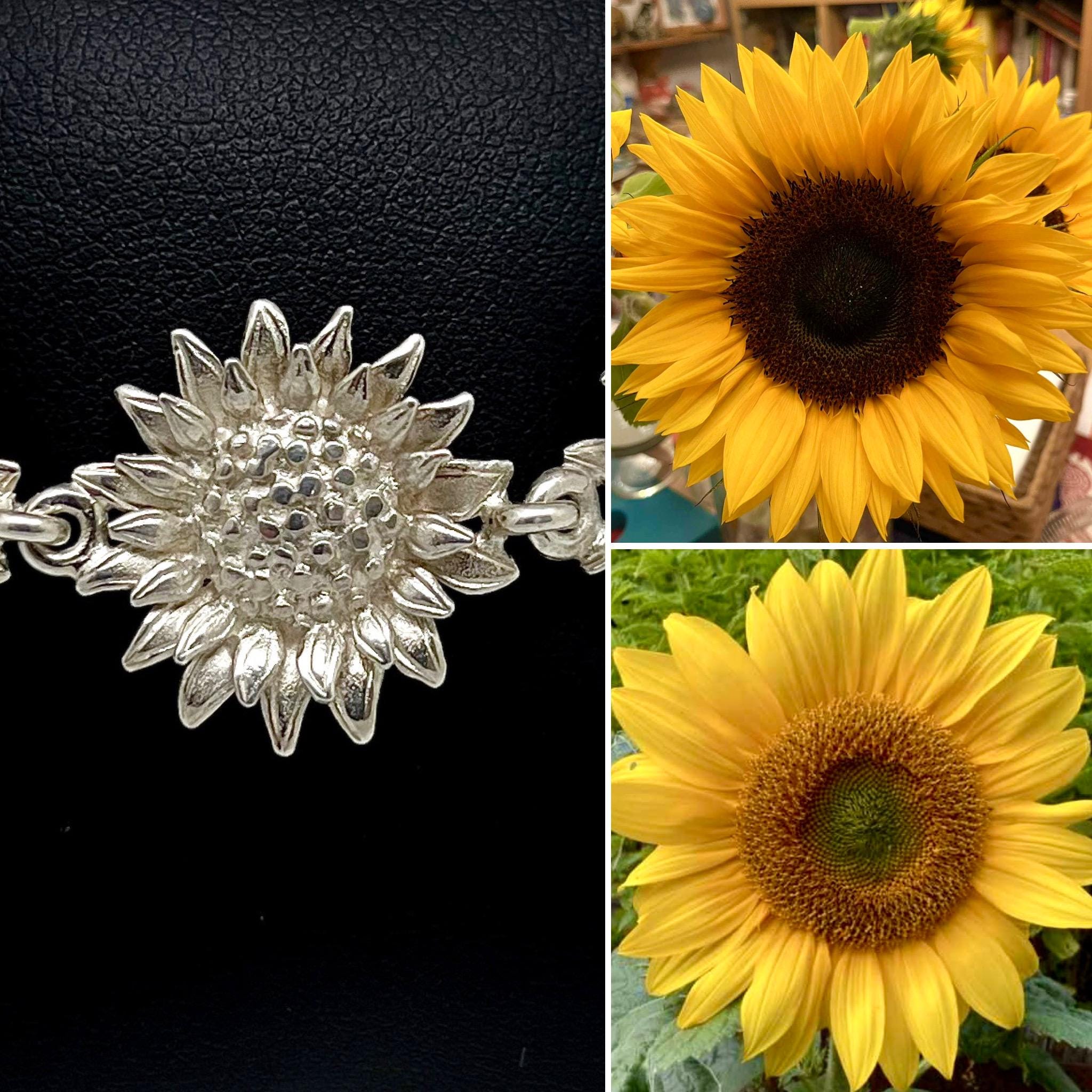 This stunning sunflower bracelet have been lovingly handmade in Cornwall by Douglas Hughes. A life-long admirer of the towering yellow sunflowers, Doug handcrafted these sunflower earrings to pay homage to the majestic yellow flora.