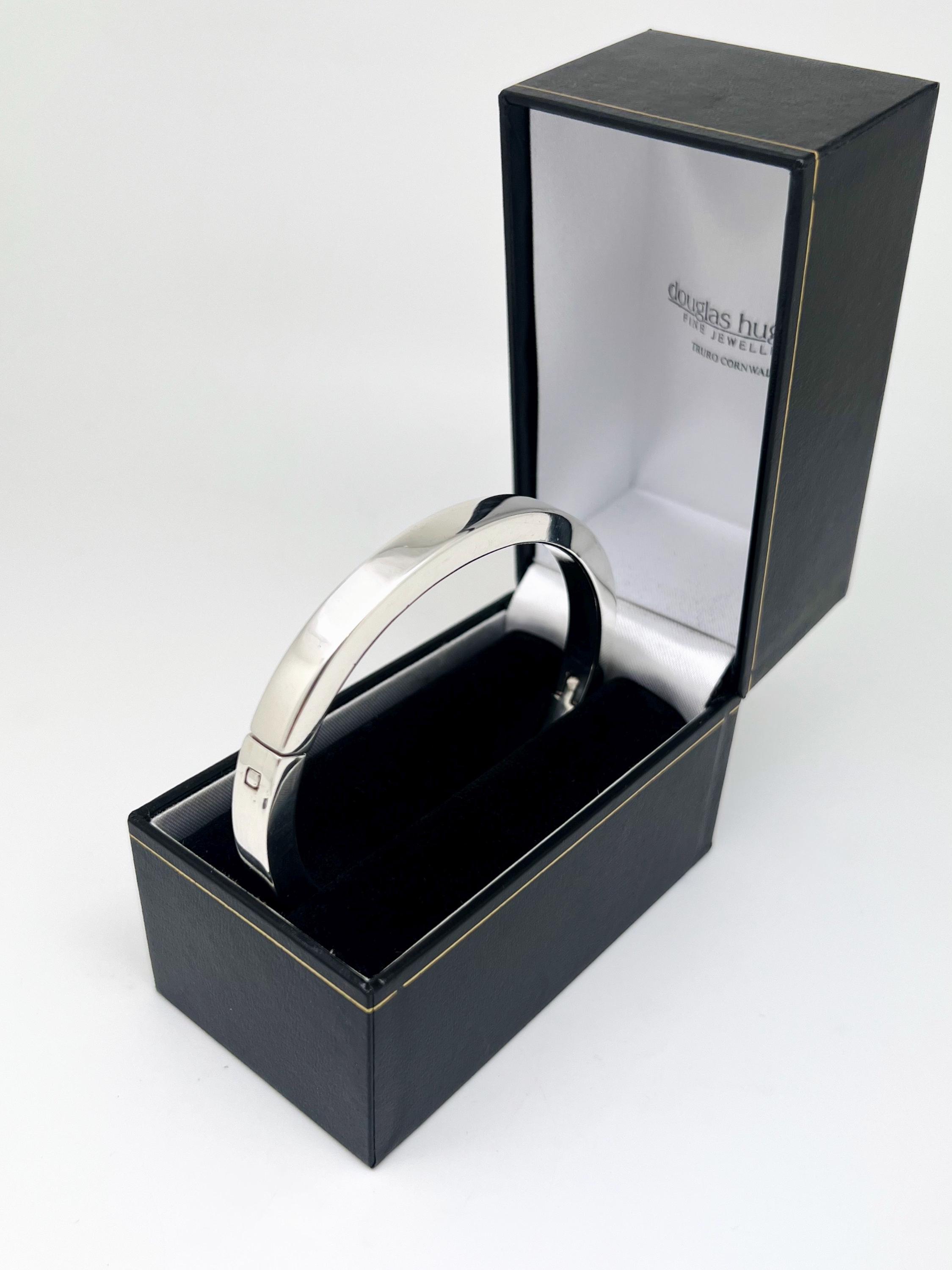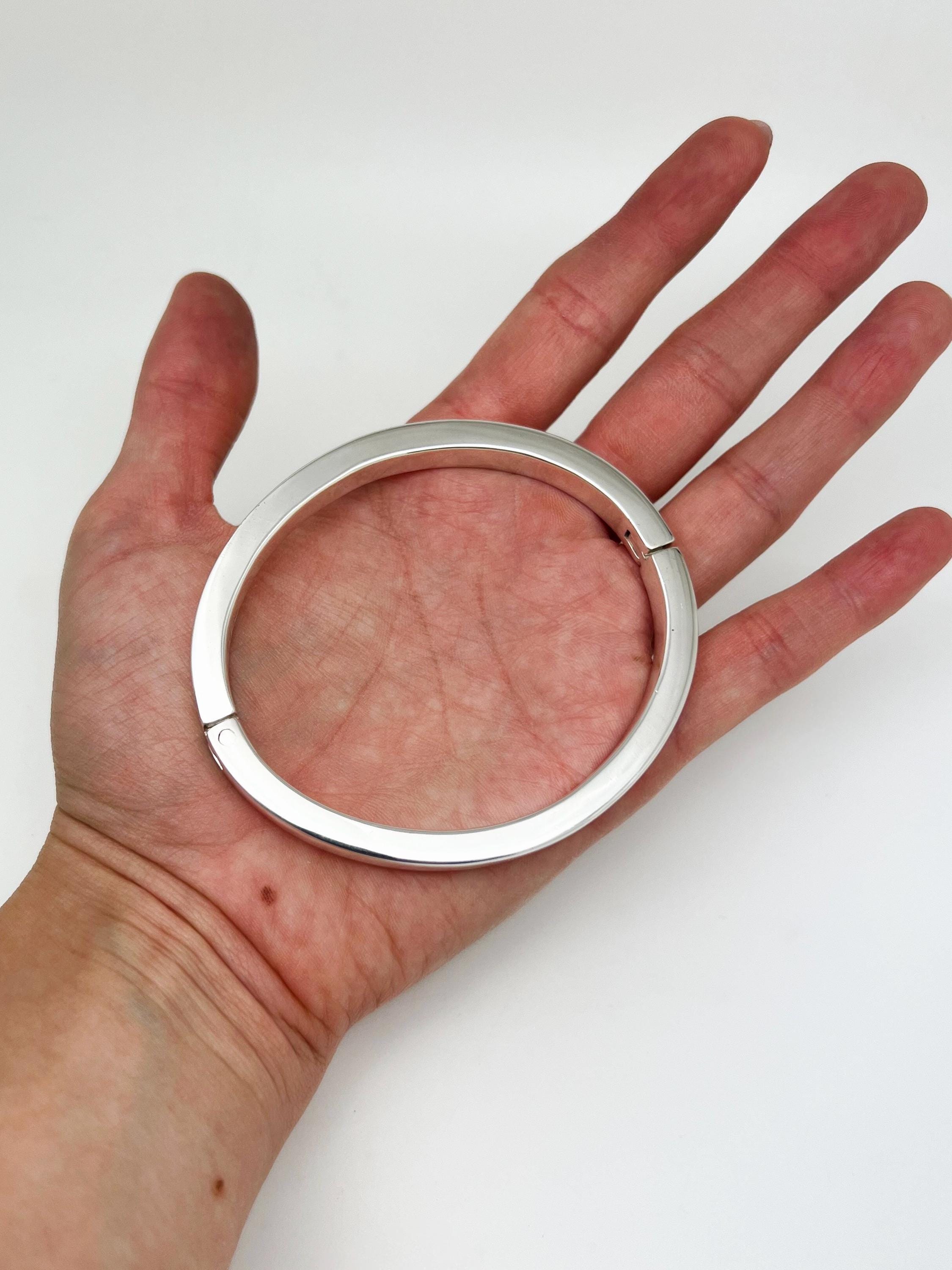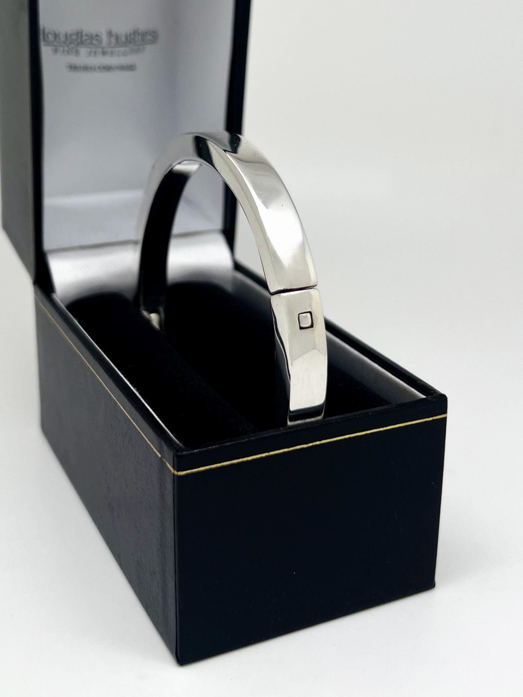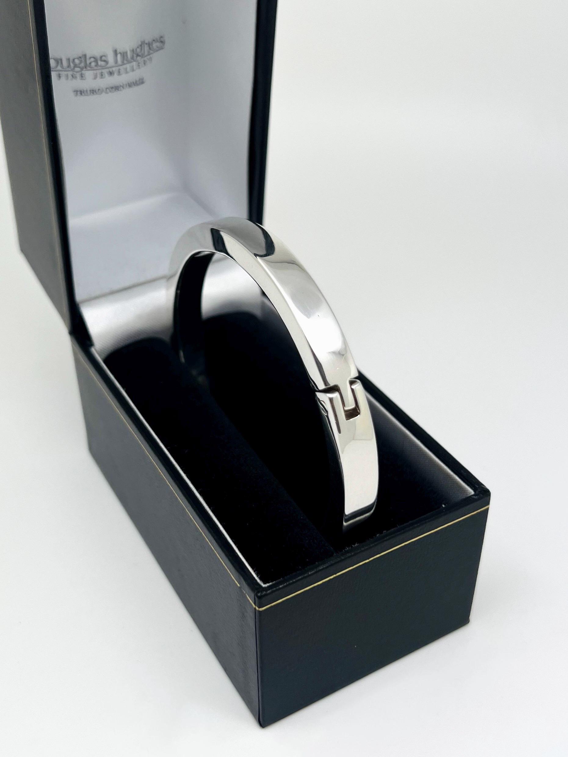 A wonderful solid and sturdy Silver Bangle with an integral hinge and fastener, it has sleek edges and weighs 101 grams.