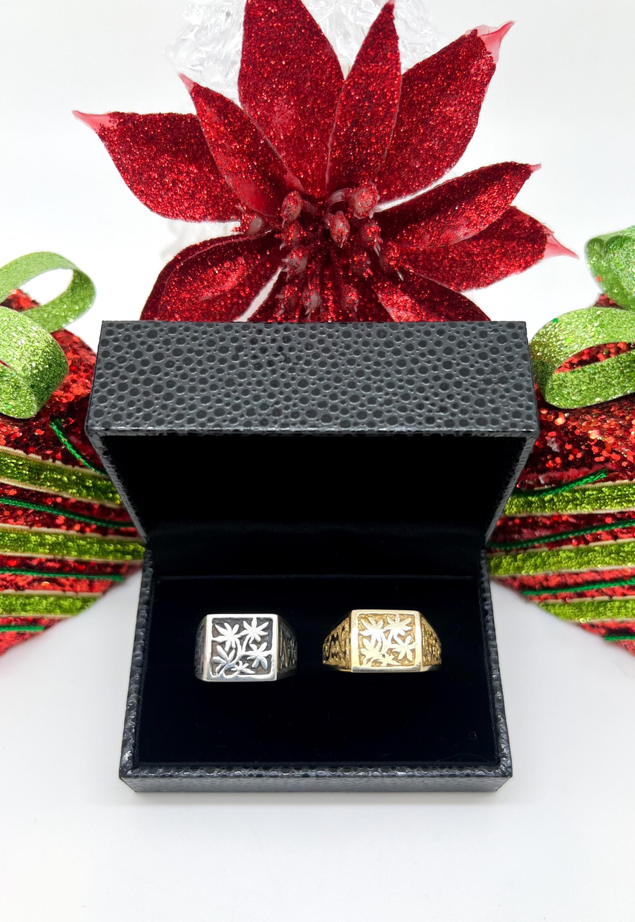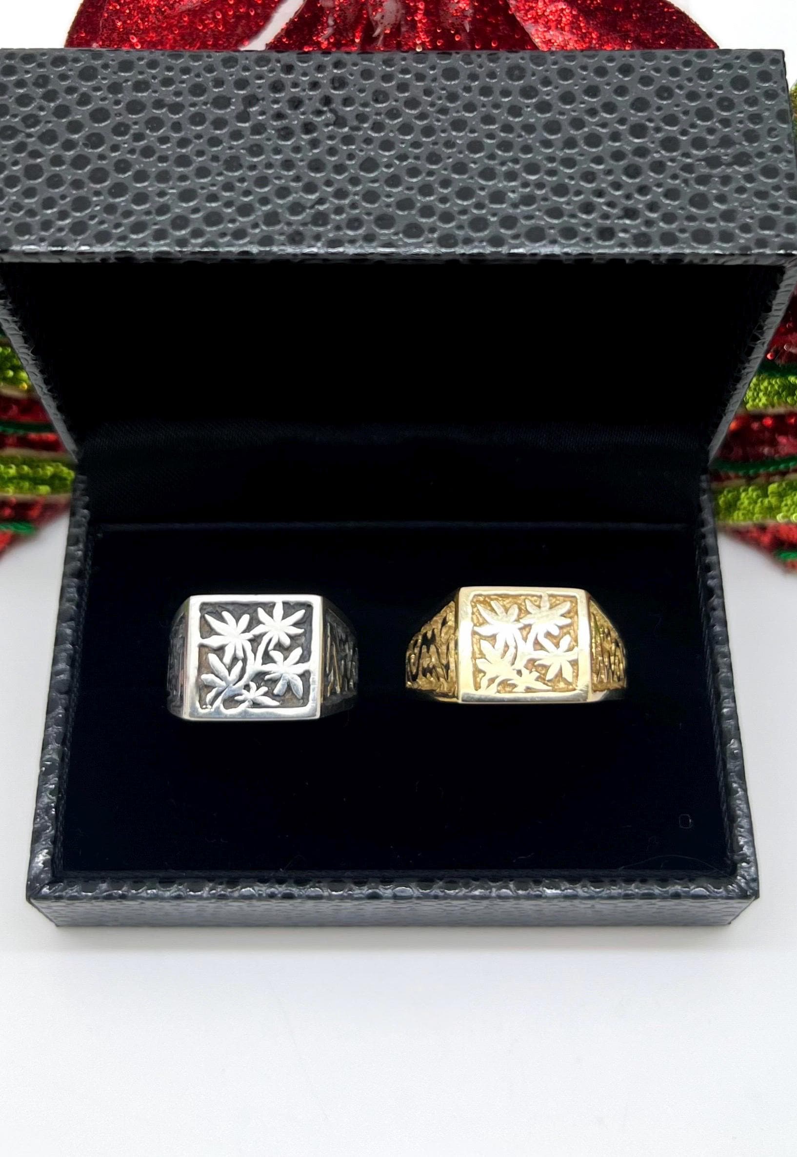 This sensational 9ct yellow gold Haze Signet ring is our contemporary interpretation of a classic. The hand-carved design has stunning detail across the marajuana leaves which are polished for an eye catching reflective surface that shimmers in light.